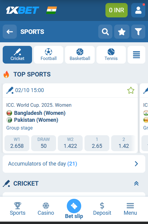 1xBet is another Curacao-licensed bookie offering its services in India. The platform features mobile applications for Android/iOS and covers IPL markets extensively. 1xBet has a separate section for cricket betting and, at the time of writing, covers 50+ events with over 500 markets available for some of them. These include 1X2, Overs Interval, Total Runs, and more. The bookmaker’s margin usually stays within the 4–5% range, while odds can reach 4.40 or higher.
